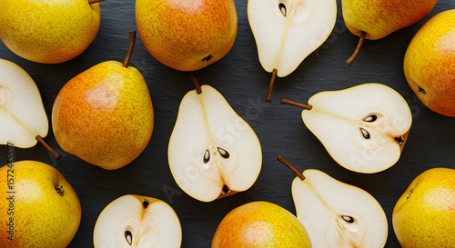 Fresh Ripe Pear Fruits and Juicy Slices Displayed on Clean Background — Healthy Organic Seasonal Fruit for Nutrition, Food Styling, and Culinary Use