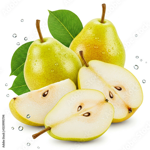 pear, fruit, slice, half, whole, food, healthy, nourishment, vitamin, diet, snack, sweet, crisp, harvest, fruit farm, market, background, isolated, ingredient, culinary, skin, flesh, seed, core, peel, leaf, stem, freshness, organic, juicy, ripe, green, yellow, gradient, texture, surface, shine, gloss, moisture, water, dripped, splash, natural, raw, fresh, delicious