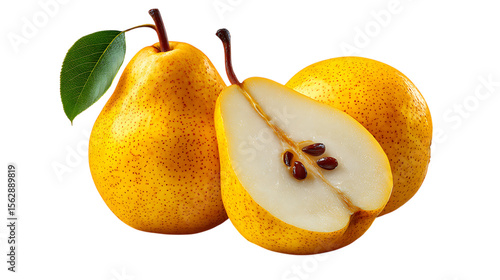 pear, fruit, yellow, food, fresh, ripe, whole, halved, cut, slice, seed, leaf, green leaf, healthy, organic, natural, sweet, juicy, delicious, vitamin, nourishment, diet, vegetarian, vegan, ingredient, produce, food photography, studio shot, isolated, white background, black background, closeup, macro