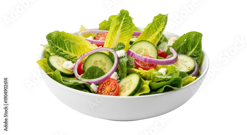 Fresh salad bowl with romaine lettuce cucumber tomatoes red onion and feta isolated on transparent background