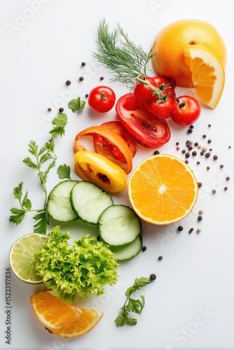 nourishment, wellness, diet, health care, lifestyle, cooking, receipe, vegetarian, vegan, organic, freshness, vitality, well-being, mindfulness, balance, food, ingredient, tomatoes, cucumber, orange, lettuce, pepper, dill, parsley, lime, citrous, slice, cut, raw, ripe, vibrant, colourful, healthy, delicious, tasty, epicure, culinary, preparation, meal, snack, lunch, dinner, white, background, studio, still, life, nobody, table