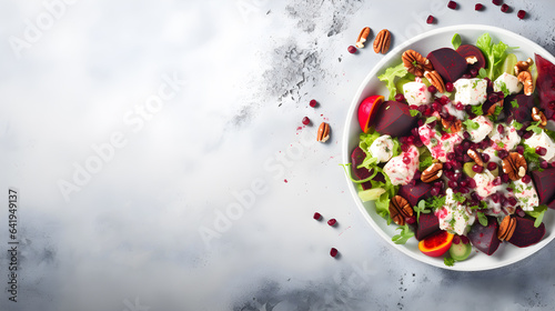 Fresh Salad with Beetroot, Feta Cheese, and Pecans, Healthy Vegetarian Meal on Grey Background