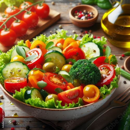 Fresh salad with bright vegetables on a wooden table, with a drop of olive oil.