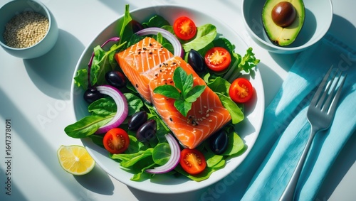fresh, salmon, salad, cherry, tomatoes, onion, olive, lemon, wedge, avocado, healthy, protein, alimentary, vibrant, colourful, delicious, seafood, vegetarian, summer, light, low-calorie, seasonal, balanced, homemade, meal, contemporary, citrous, green, red, textural, mouth-watering, nourishment