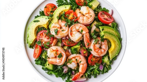 Fresh shrimp salad with avocado, tomatoes, and cucumbers