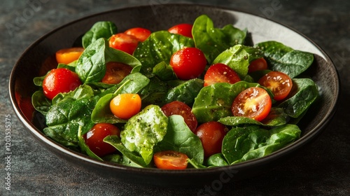 Fresh Spinach and Cherry Tomato Salad in a Dark Bowl with a Textured Background perfect for healthy and vegetarian eating choices