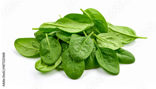 Fresh spinach leaves pile, vibrant green, isolated on white background, healthy eating concept