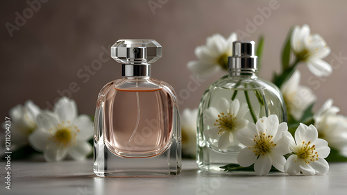Fresh spring romantic image, stylish transparent glass perfume bottles.with white flowers on side Stylish parfumerie banner. without text