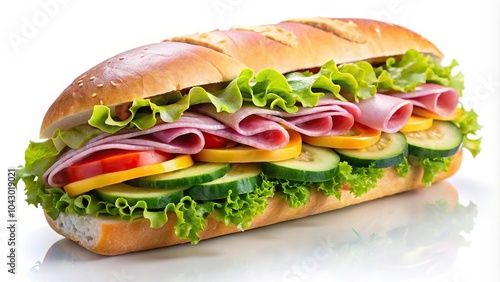 Fresh submarine sandwich with ham cheese tomato cucumber lettuce and onion isolated on white background