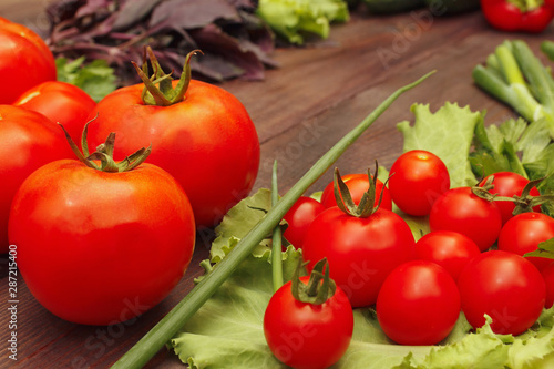 Fresh summer tomatoes and greens on a wooden table