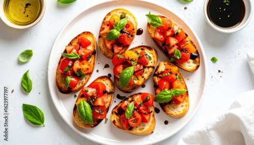 Fresh tomato and basil bruschetta on toasted bread, garnished with balsamic glaze and olive oil on a white plate.