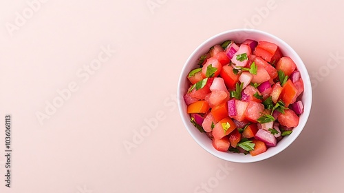 Fresh tomato and onion salad with herbs, vibrant and colorful dish, served in white bowl, healthy and delicious meal, minimalist food presentation, pastel background