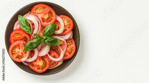 tomatoes, onion, salad, basil, plate, fresh, vegetable, culinary, cookery, appetising, healthy, organic, vibrant, food, garnish, sliced, raw, alimentary, round, delicious, vegetarian, leaf, green, ingredient, dish, herb, mediterranean, kitchen, epicure, preparation, diet, lunch, snack, texture, closeup, rustic, meal, receipe, decorative, refresh, colours, bright