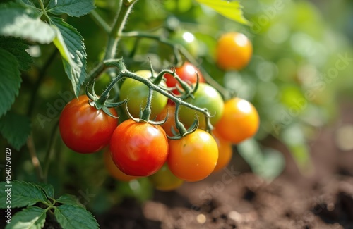 Fresh tomatoes ripening in home garden during summer. Red, orange, green tomatoes on vine. Gardening, horticulture, agriculture, healthy organic food, sustainable cultivation in backyard. Natural