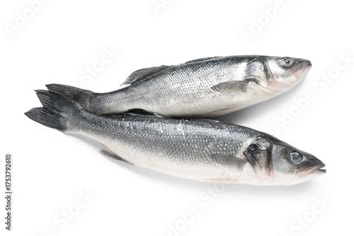 Fresh uncooked seabass fish isolated on white background, closeup
