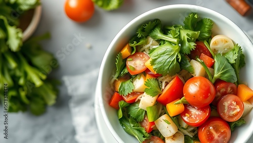 Fresh vegetable salad in a white bowl, captured from above with natural lighting and a clean kitchen backdrop.