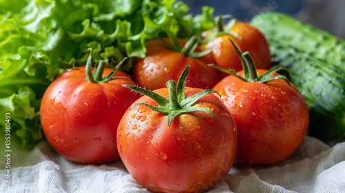 Fresh vegetables including tomatoes, cucumbers, and lettuce in tight composition, clean produce layout