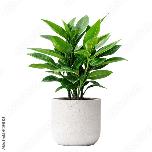 Fresh vibrant green indoor houseplant with broad glossy leaves in a simple white pot for home decoration and plant care concepts on transparent background