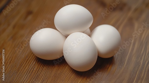 Fresh white chicken eggs stacked on a rustic wooden table showcasing natural textures and organic farm freshness for culinary themes.