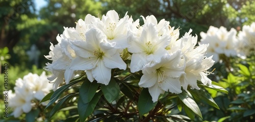 Fresh white rhododendron blooms against blurred garden background, soft focus, beautiful gardens, sunlight
