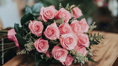 Freshly arranged bouquet of delicate pink roses with green foliage displayed on a rustic wooden table, showcasing elegant floral artistry.