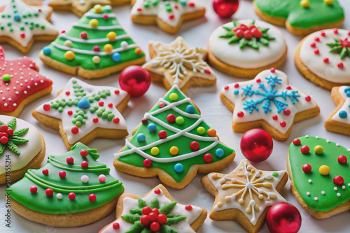 Freshly baked assortment of colorful Christmas cookies, decorated with icing and sprinkles, arranged artfully on a clean white background, evoking festive holiday cheer.