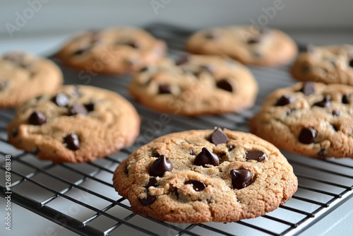 Freshly baked chocolate chip cookies cooling on a wire rack, showcasing their golden brown texture and rich chocolate chips.