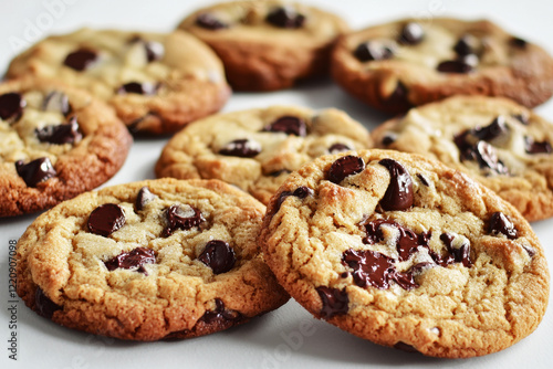 Freshly baked chocolate chip cookies with gooey centers create a mouthwatering treat on a clean white background