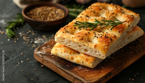 Freshly baked flatbread with sesame seeds and rosemary sprigs on wooden cutting board.