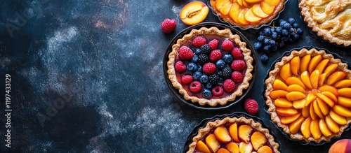 Freshly baked fruit tarts with various fruits on a dark background with copy space for text