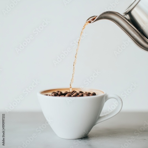 Freshly Brewed Coffee Pouring Into White Cup Surrounded by Coffee Beans on Table