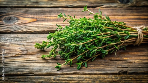 Freshly harvested thyme sprigs with a rustic wooden background, herbs, flowers, herbs, flowers,thyme, seasonings, kitchen