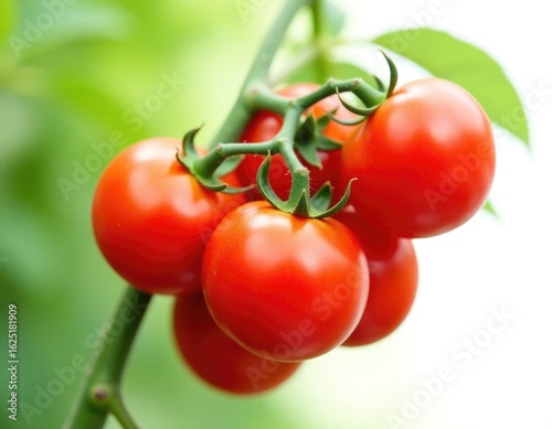 Freshly picked red tomatoes hang from a green branch