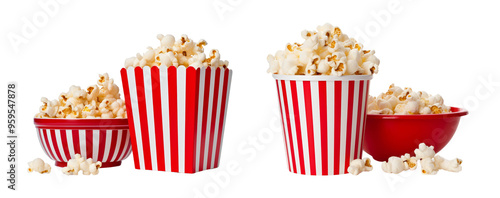 Freshly popped popcorn in striped boxes, perfect for snack time or movie nights, offering a delicious and crunchy treat.