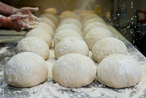 Freshly Prepared Dough for Baking. Rows of Raw Dough Balls on Floured Table in Bakery.