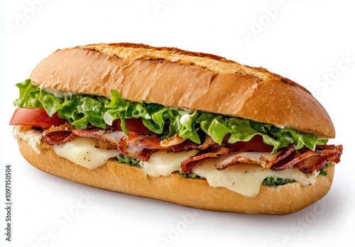 Freshly prepared sandwich with lettuce, tomato, and cheese in a light setting
