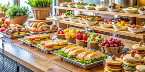 Freshly prepared sandwiches, fruits, and pastries neatly arranged on a modern counter, ready for quick pickup and consumption on the busy morning routine.