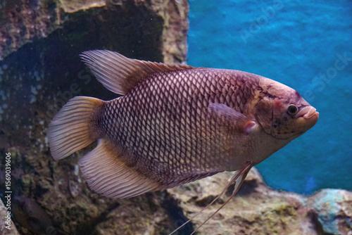 Freshwater fish. Swimming Fish Close-Up. School fish in freshwater cory. Close-Up of Colorful Tropical Fish in Tank Aquarium, Thailand, Asia
