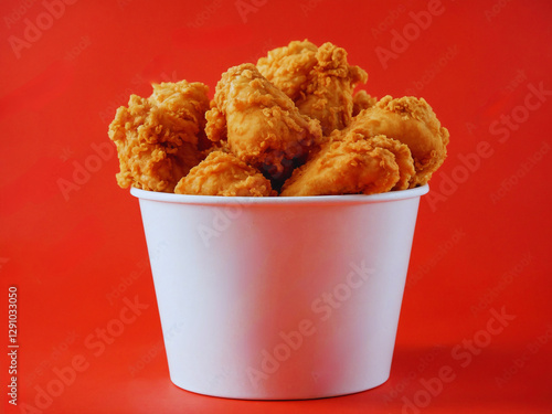 Fried Chicken in White Bucket with French Fries on Clean Red Background