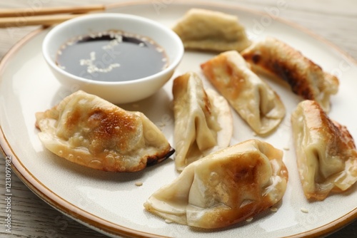 Fried gyoza dumplings with soy sauce on wooden table, closeup