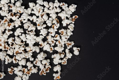 fried popcorn on a black background close-up, ready-to-eat food