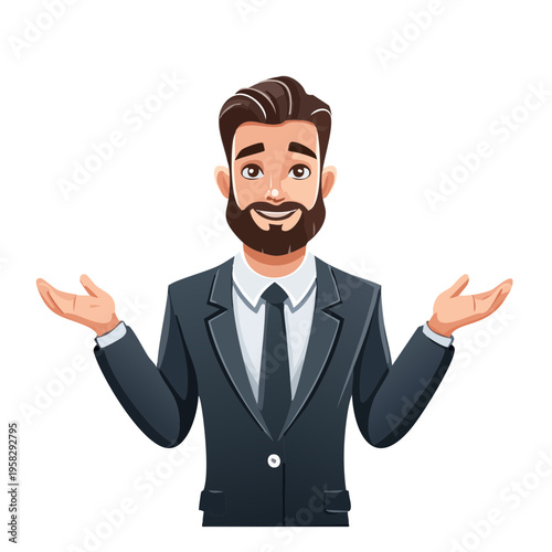 man, male, businessman, person, professional, office, suit, attaching, beard, gesticulate, presenting, welcoming, friendly, happy, smiling, isolated, illustration, cartoon, character, service, support, advice, explanation, communication, idea, concept, leadership, entrepreneur, employee, men at work, business, corporate, marketing, sale, success, positive, confident, approachable, knowledgeable, offering, guidance, tutorial, assistant, adult