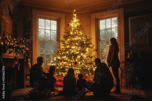 Friends and family gathered around a Christmas tree.