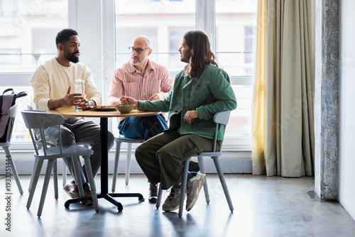 beverage, bowl, bright, business, businessman, cafes, casual attire, collaboration, colleague, communication, conversation, cooperation, creative, daylight, design, dining, discussion, diversity, drink, food, friends, idea, indoor, interior, lunch, man, meeting, man, modern, office, people, plate, relaxed, sitting, social, successful, table, talk, talking, teamwork, three, window, working