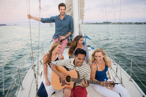 adventure, california, carefree, casual clothes, day, female, friendship, fun, guitar, male, man, music, outdoors, sailboat, sailing, san diego, sea, smiling, togetherness, travel, us, vacation, water, wearing, woman, young men, missy