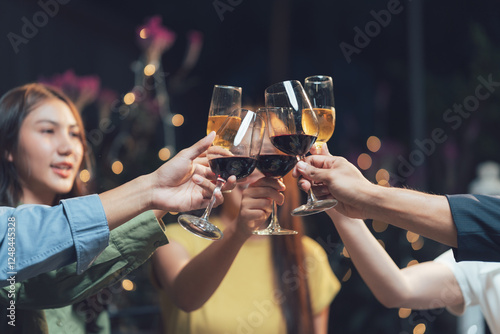 Friends Toast: A group of diverse friends raise their wine glasses in a celebratory toast, their faces illuminated by the warm glow of festive lights in the background.