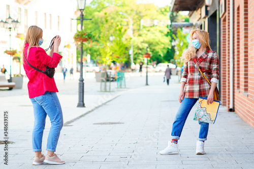 Friends travelling in the european city. Girls making photo on camera. Stylish girls walking at street. Coronavirus quarantine.