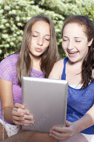 bonding, carefree, day, enjoyment, female, friendship, fun, girl, happiness, leisure, looking, outdoors, relaxation, sister, smiling, technology, teenage girl, togetherness, two people, using