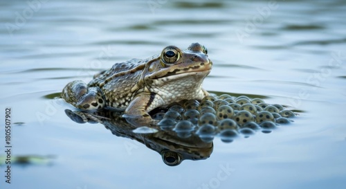 Frog resting atop a clutch of eggs in still water, reflection visible