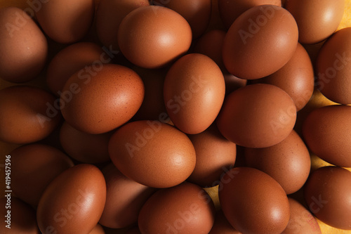 From above of full frame background of heap of raw brown chicken eggs